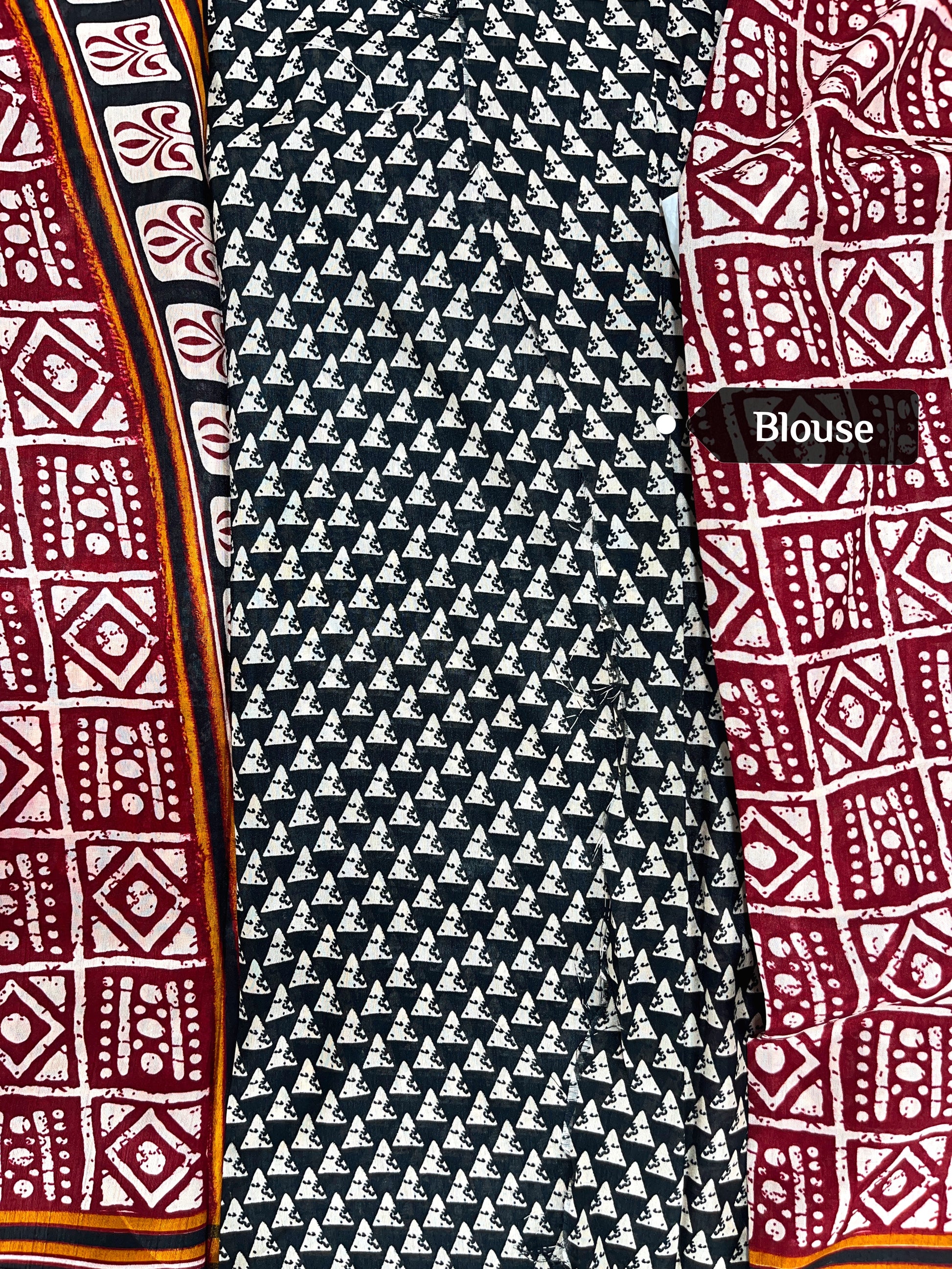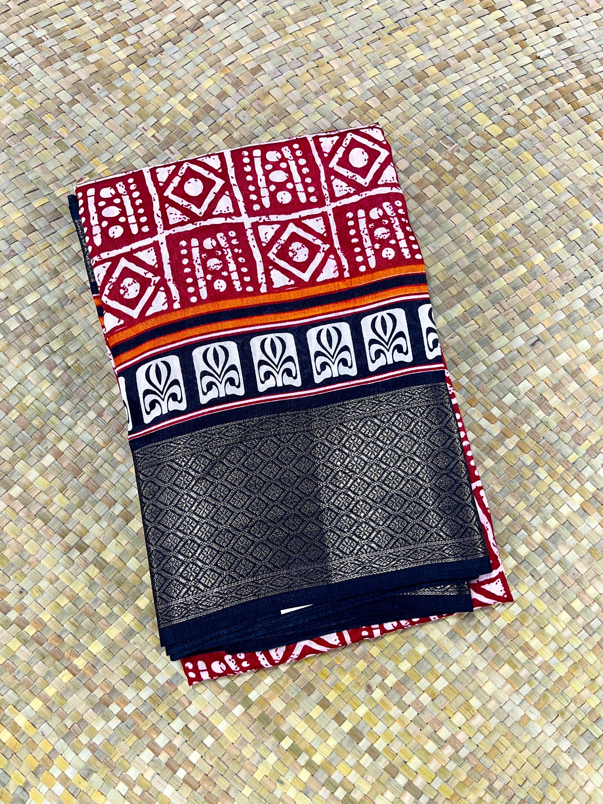 Discover the striking beauty of the Ajrakh Printed Saree in vibrant red, accented with a bold black border. Expertly crafted using traditional block printing, this saree combines rich colors and intricate patterns to create a captivating look. Made from breathable cotton, it ensures comfort throughout the day while adding a touch of timeless elegance to your wardrobe. Perfect for celebrations or everyday wear, this saree lets you showcase heritage artistry with confidence and style.