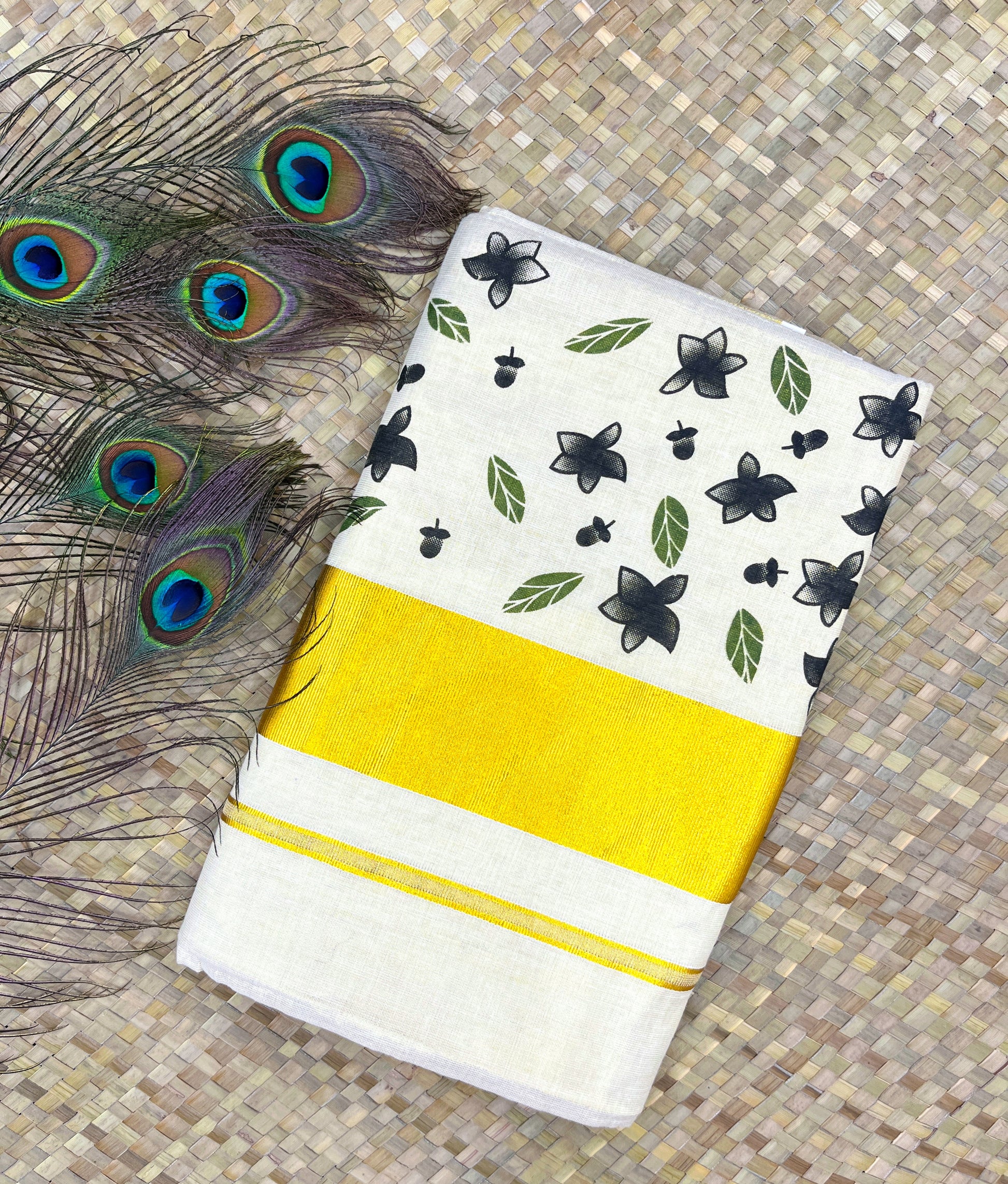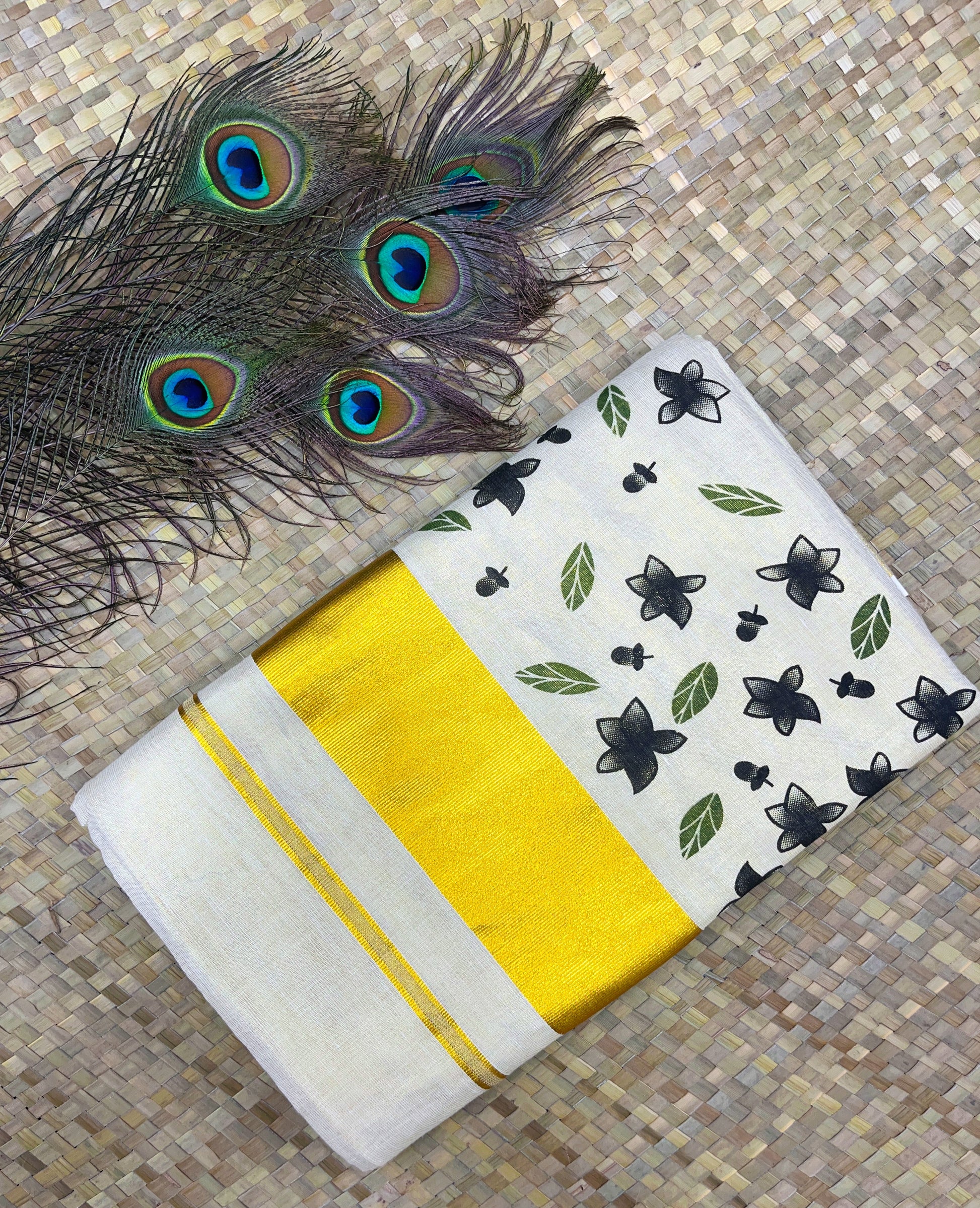 The Black Floral with Golden Zari Tissue Set Saree combines floral elegance with the shimmer of golden zari, creating a perfect ensemble for Onam’s grand festivities.