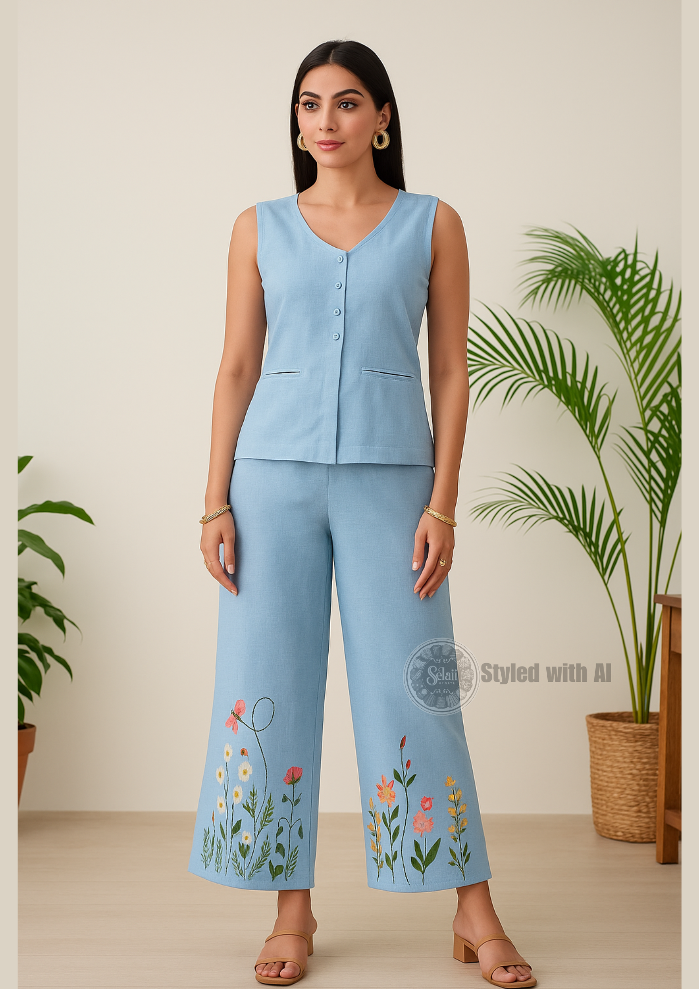 Refresh your summer wardrobe with this Blue Sleeveless Embroidered Cotton Slub Co-ord Set. Made from 100% breathable cotton slub, this two-piece set includes a sleeveless V-neck top with button detailing and straight-fit pants featuring delicate floral embroidery at the hem. The textured weave adds a natural charm, making it perfect for casual outings or relaxed gatherings.
