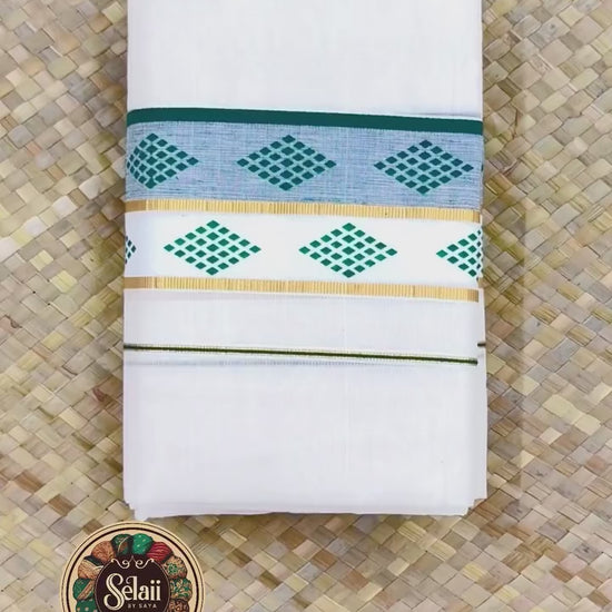 Step into sophistication with the Bottle Green Diamond Printed with Golden Zari Set Mundu. The diamond print and golden zari detailing create a refined and luxurious festive look, perfect for Onam celebrations.