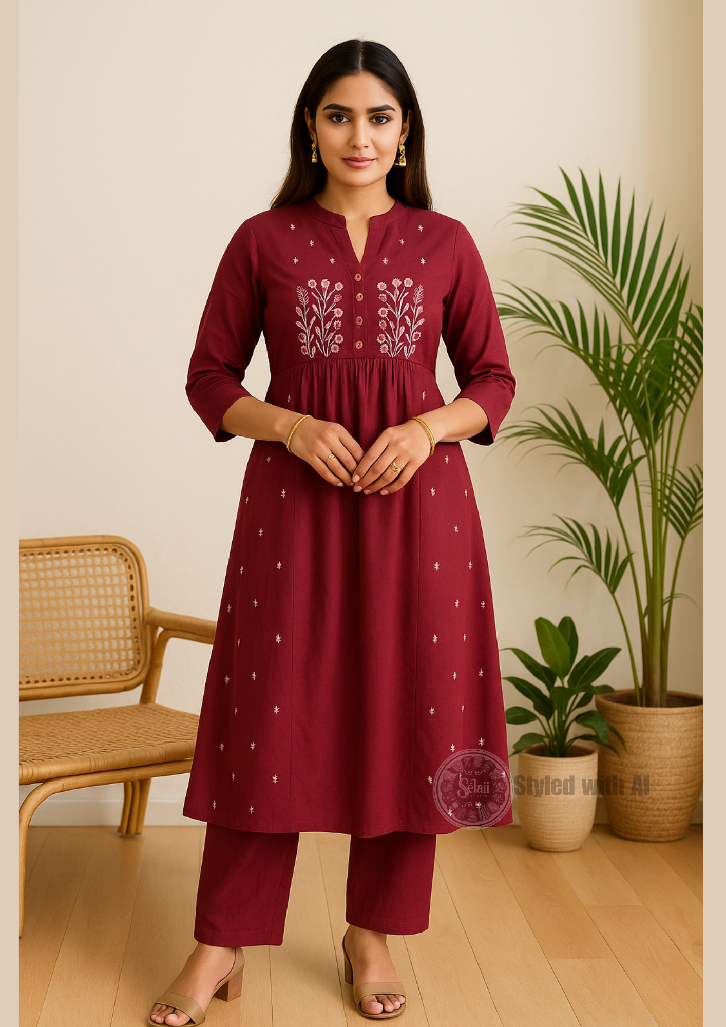 Add elegance to your workwear with this Dark Mauve Straight Embroidered Cotton Kurta Pant Set. The soft cotton fabric ensures comfort, while the delicate embroidery and straight-cut design create a refined, office-appropriate look that's equally suited for casual outings.