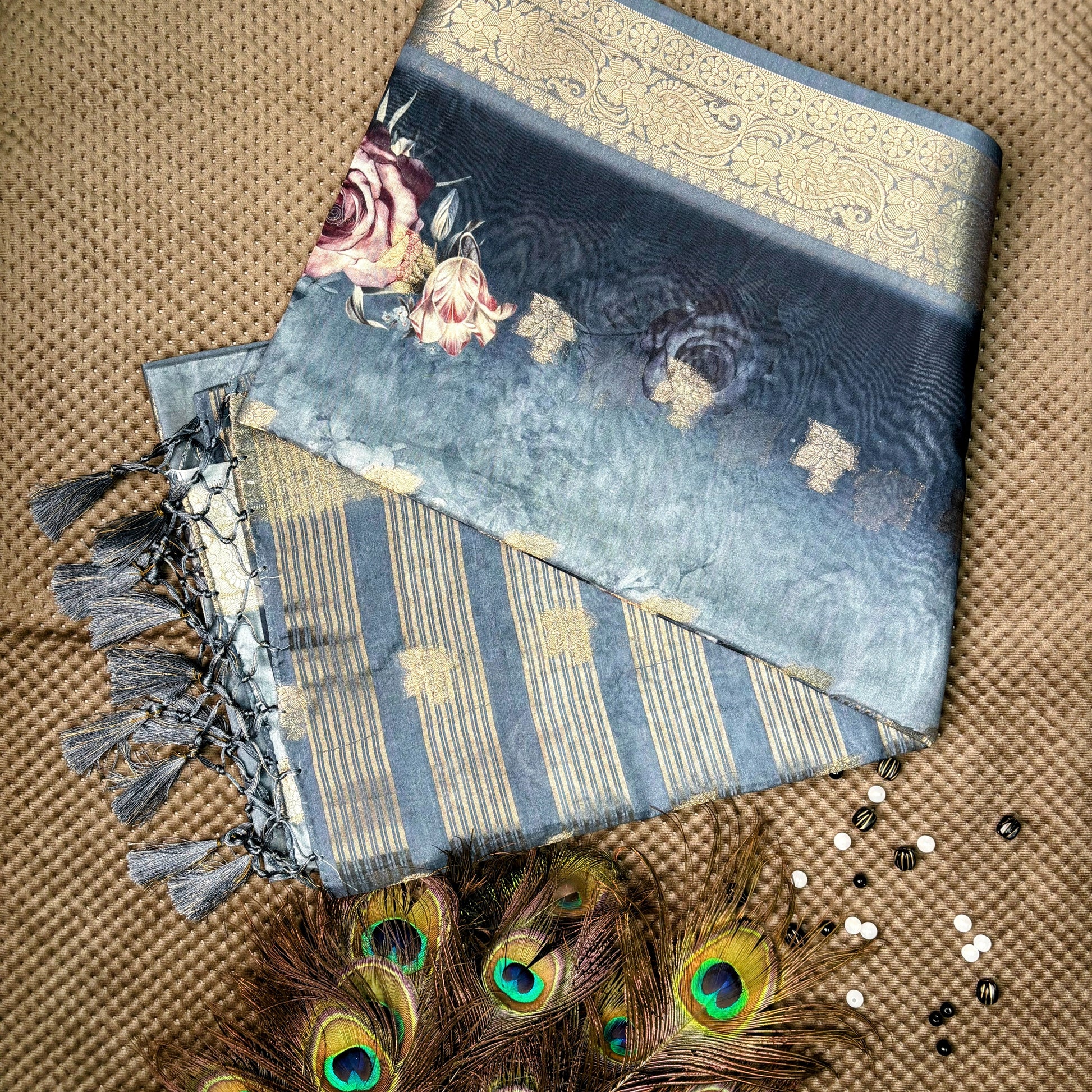 Elevate your elegance with this dark blue floral printed saree, designed to bring a timeless charm to your wardrobe. The rich color and delicate floral patterns create a graceful look perfect for both festive occasions and casual gatherings. Lightweight and comfortable, this saree drapes beautifully, ensuring you stand out with effortless style. Add a touch of sophistication to your collection with this versatile piece.