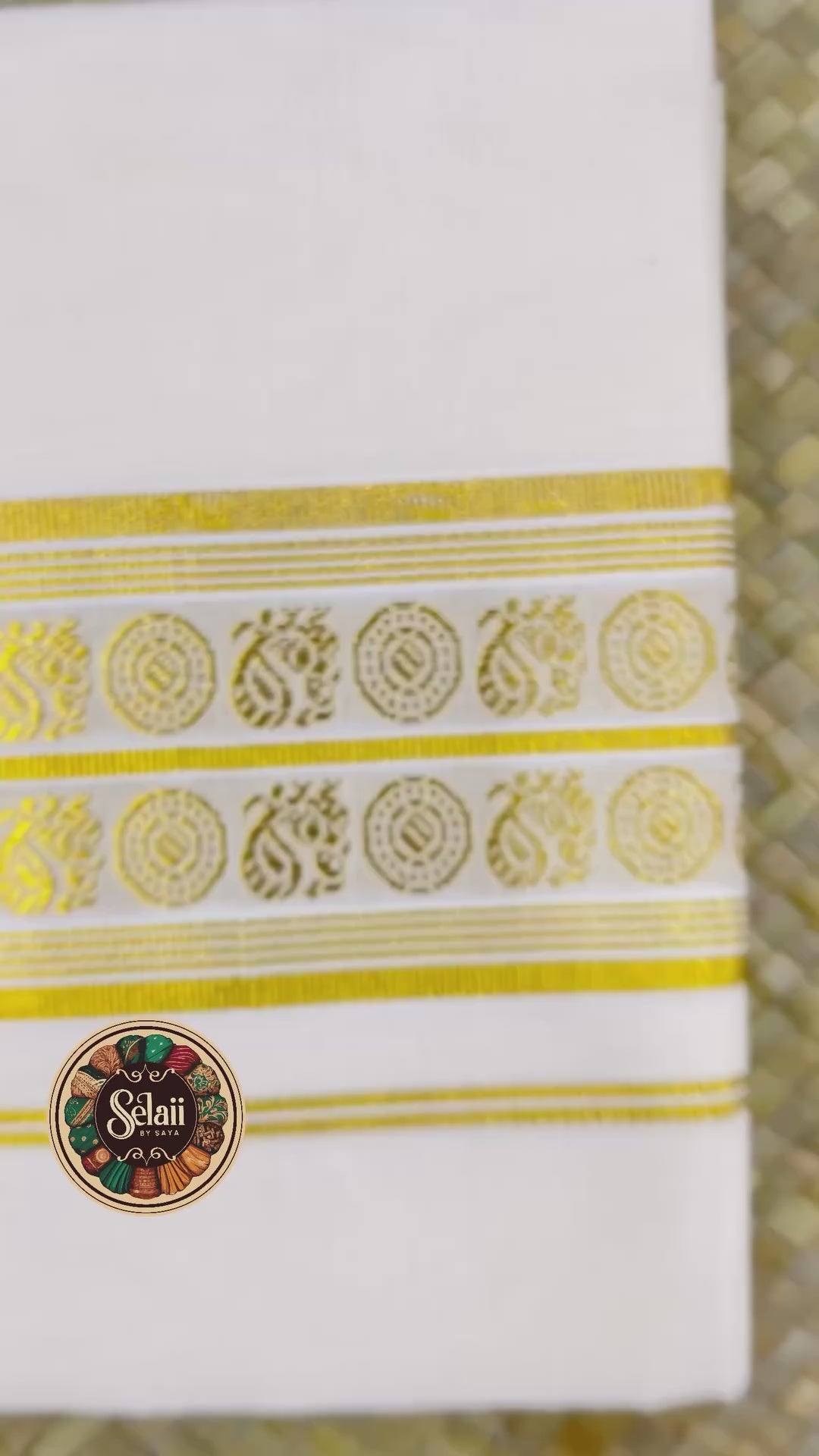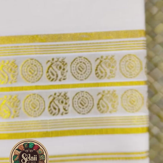 Celebrate Onam with the majestic Golden Zari Peacock Set Mundu. Featuring intricate peacock motifs and shimmering golden zari, this set captures regal elegance, perfect for grand celebrations.