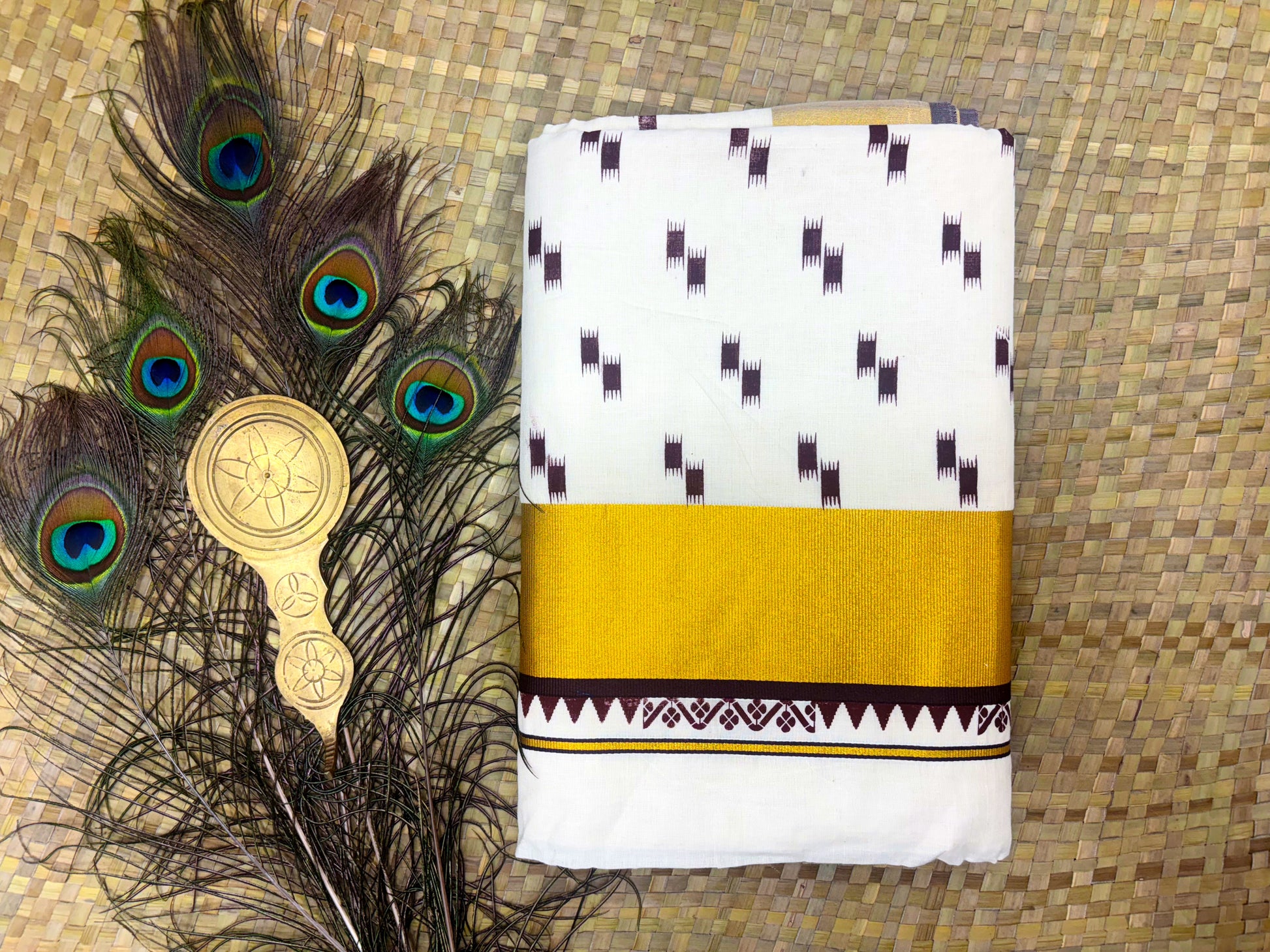 This Golden Zari with Brown Print Set Saree offers a warm, festive charm. The golden zari detailing and brown print create an elegant and refined look, perfect for Onam’s celebrations.