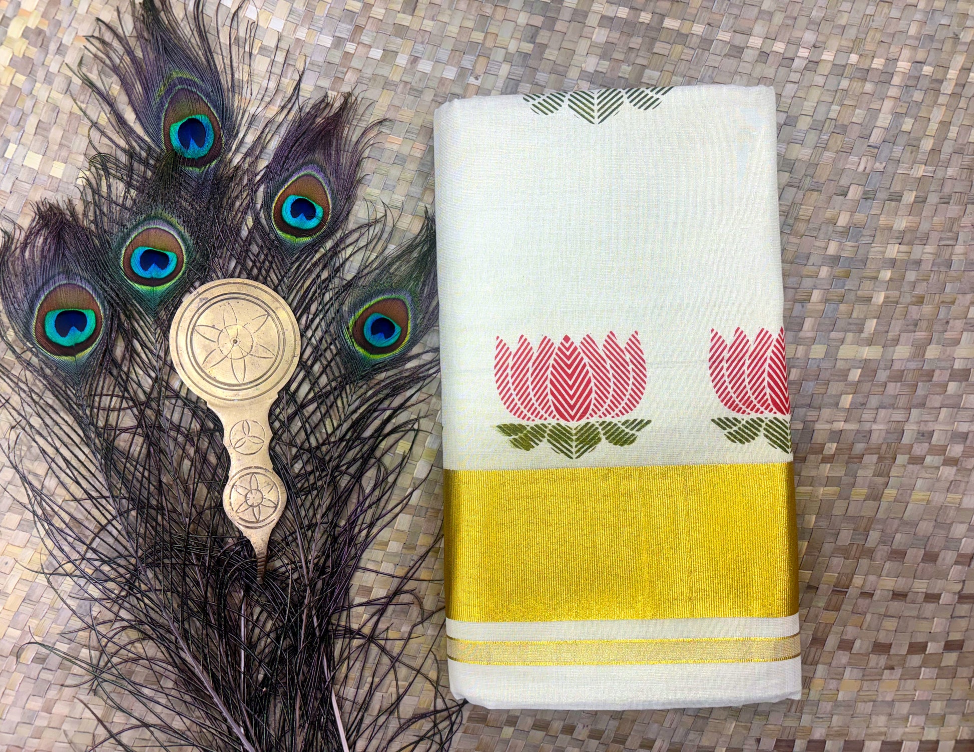 The Golden Zari with Lotus Print Tissue Set Saree is a symbol of grace. The lotus print and shimmering golden zari elevate your Onam look with timeless beauty and elegance.