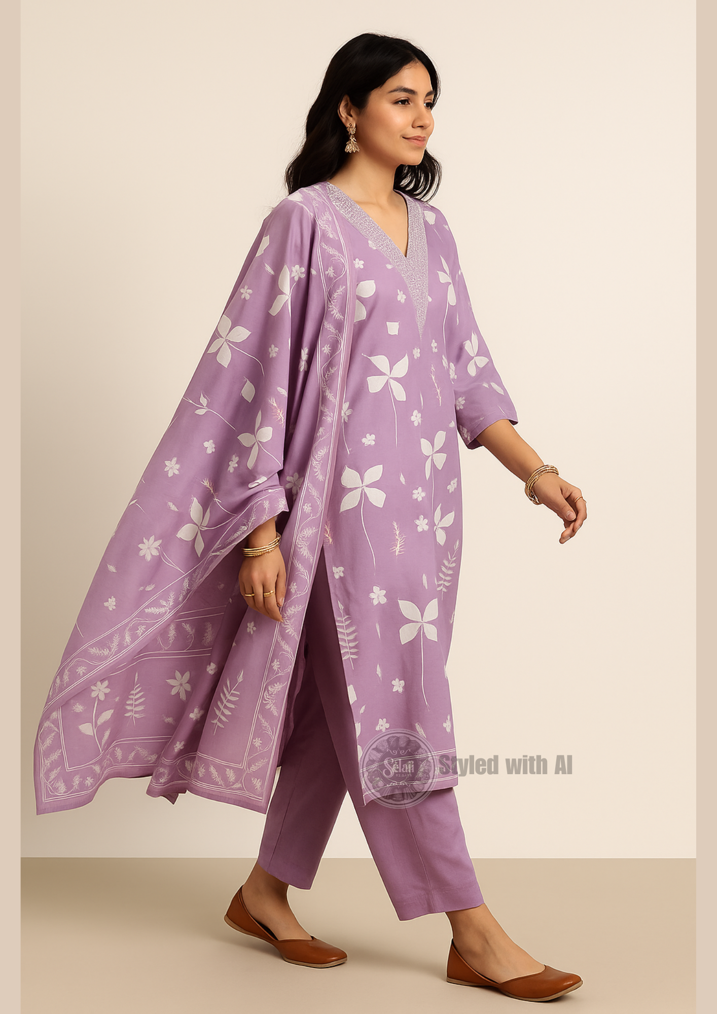 Experience comfort and style this summer with our Lilac Floral Print Suit Set. Crafted from organic cotton, this breathable fabric keeps you cool while being gentle on your skin and the environment. The vibrant lilac floral design adds a fresh, elegant touch to your wardrobe, making it perfect for casual outings or festive occasions. Embrace sustainable fashion without compromising on grace and comfort.