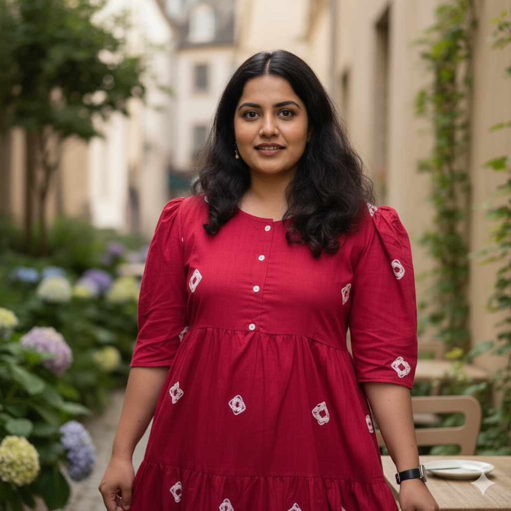 Elevate your wardrobe with this Maroon Flared Printed Cotton Midi Dress, designed for comfort and style. Crafted from breathable cotton, it offers a soft feel perfect for all-day wear. The flared silhouette enhances your natural shape, while the elegant printed pattern adds a touch of sophistication.