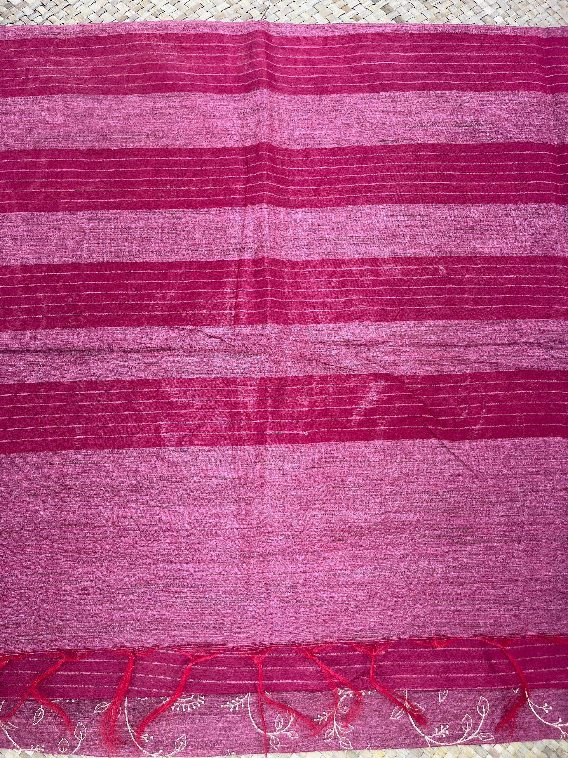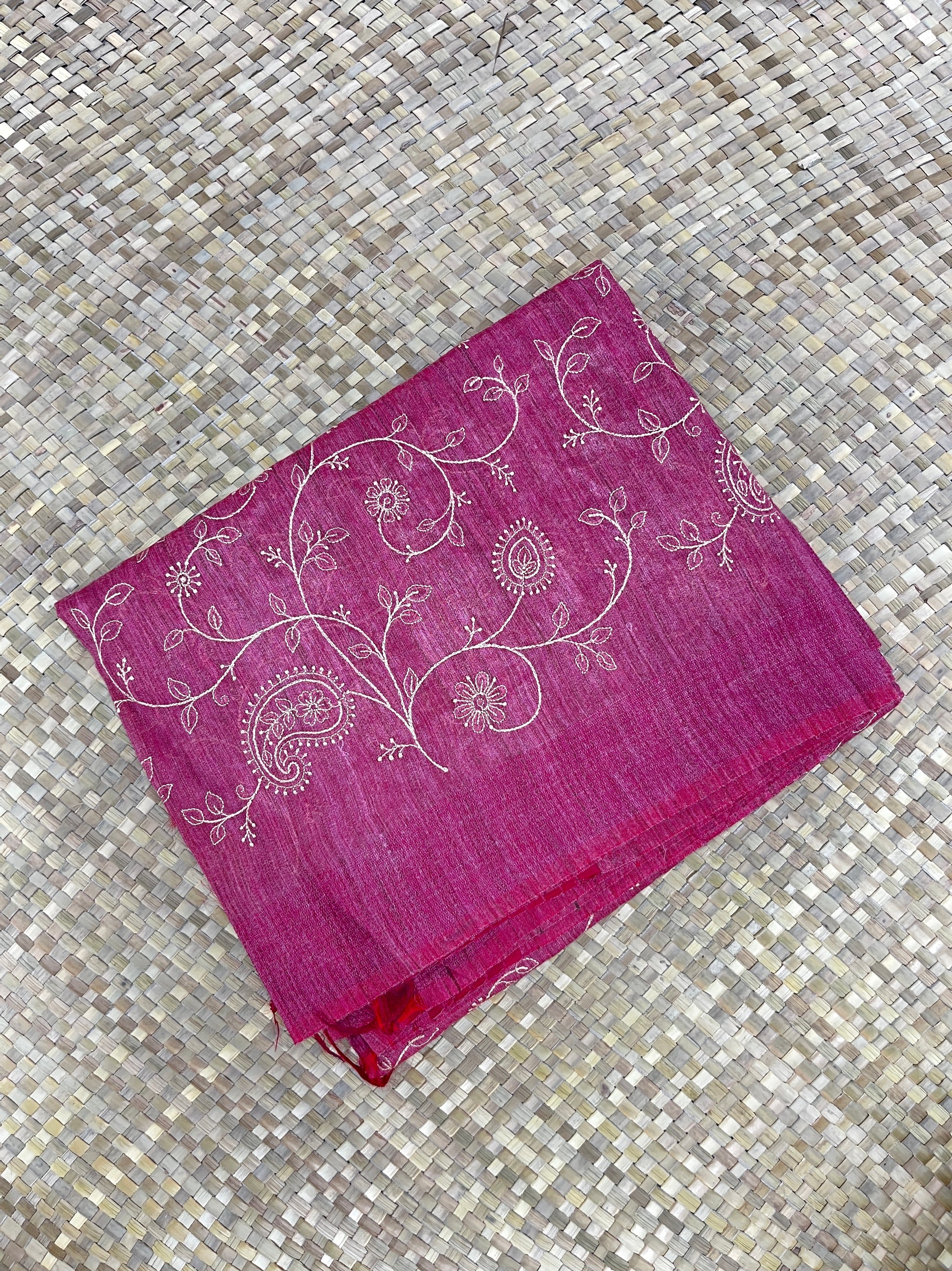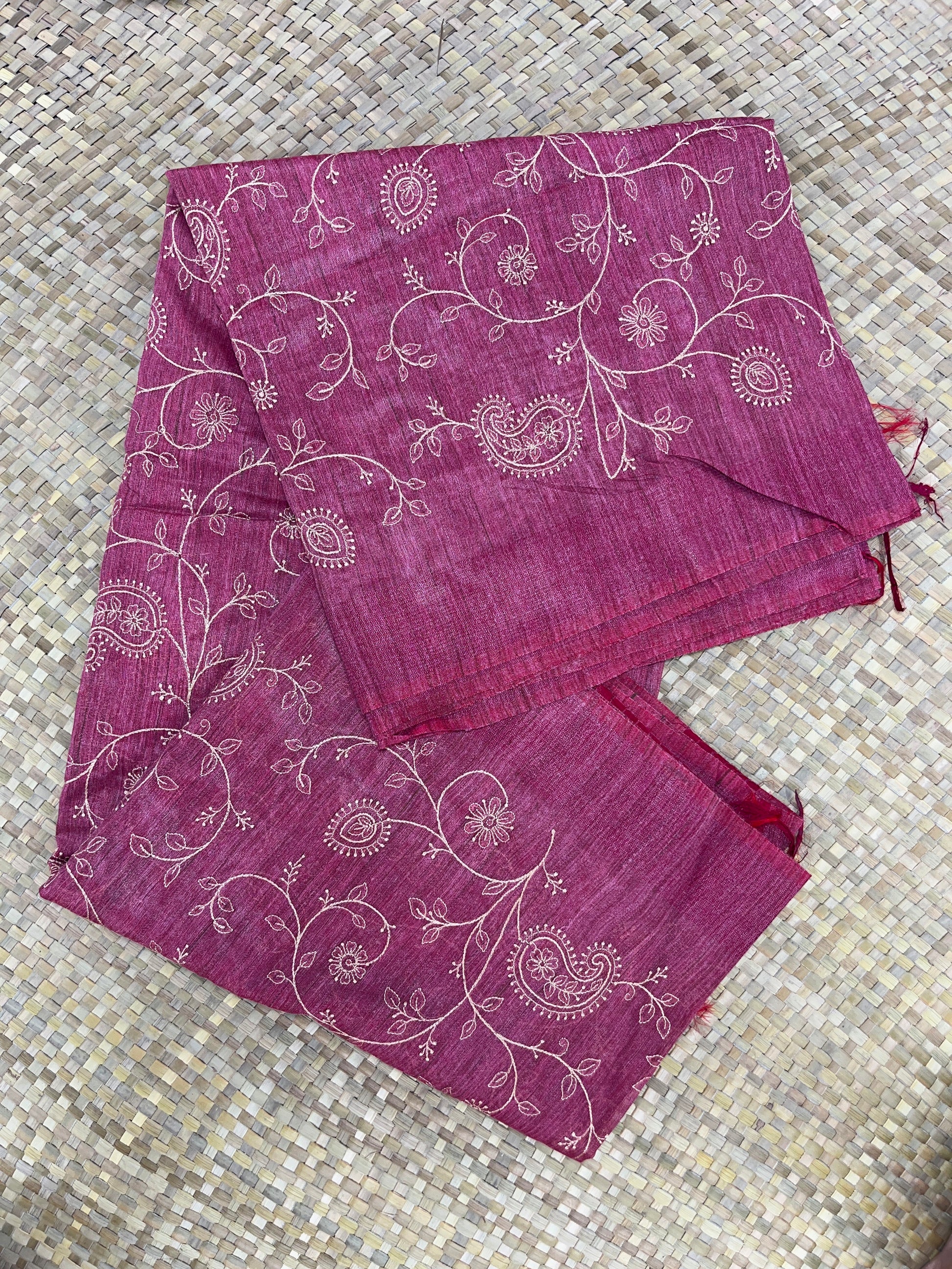 Elevate your elegance with this stunning pink saree adorned with delicate floral embroidery. Its intricate design adds a touch of grace and femininity, perfect for special occasions or festive celebrations. Lightweight and comfortable, this saree ensures you look radiant while feeling at ease all day long. Make a memorable impression with timeless beauty and exquisite craftsmanship.