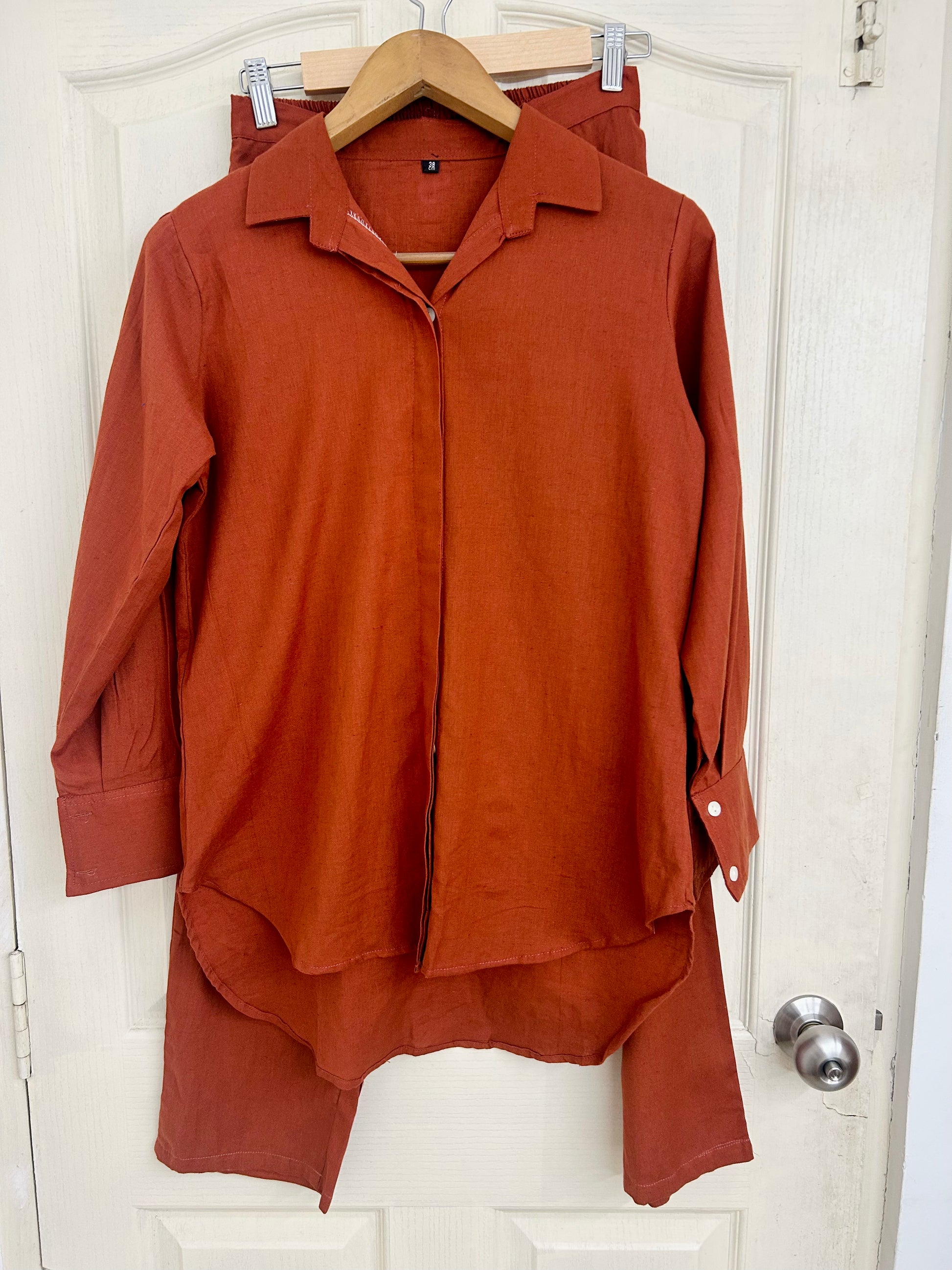 Crafted from high-quality rust-colored cotton, this co-ord set offers unbeatable comfort and style. With no chance for color fade, you can confidently wear this set time and time again. Perfect for any occasion, stay in fashion with this versatile and durable set.